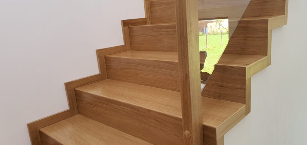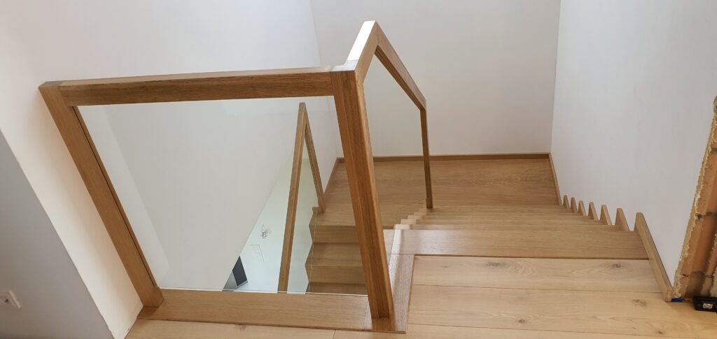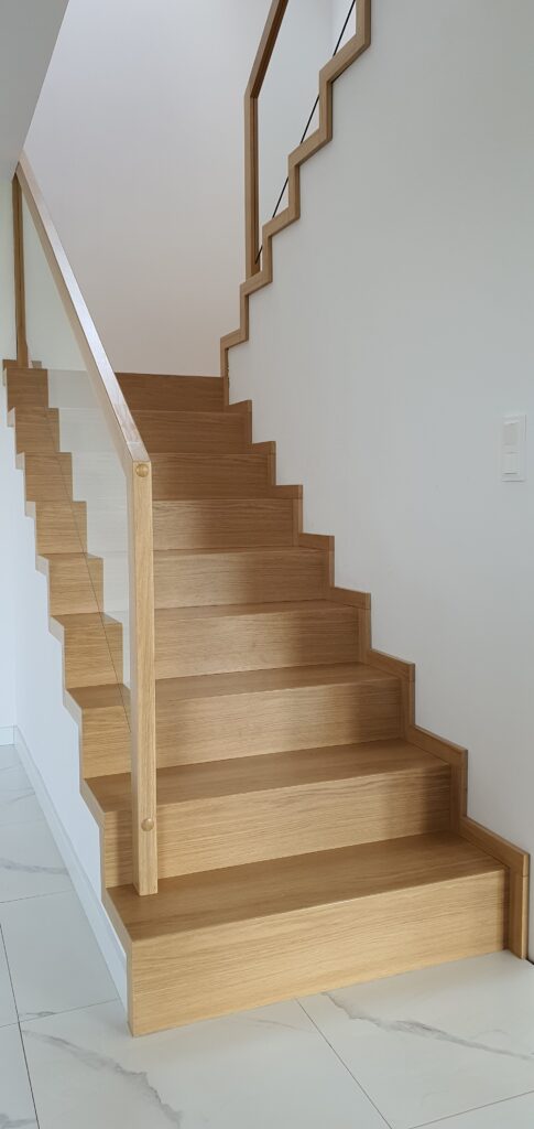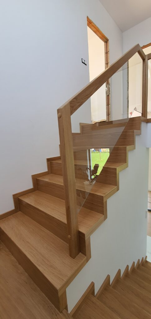 Schody dywanowe dąb natura. Balustrada wypełniona szkłem. Realizacja Żory-Baranowice